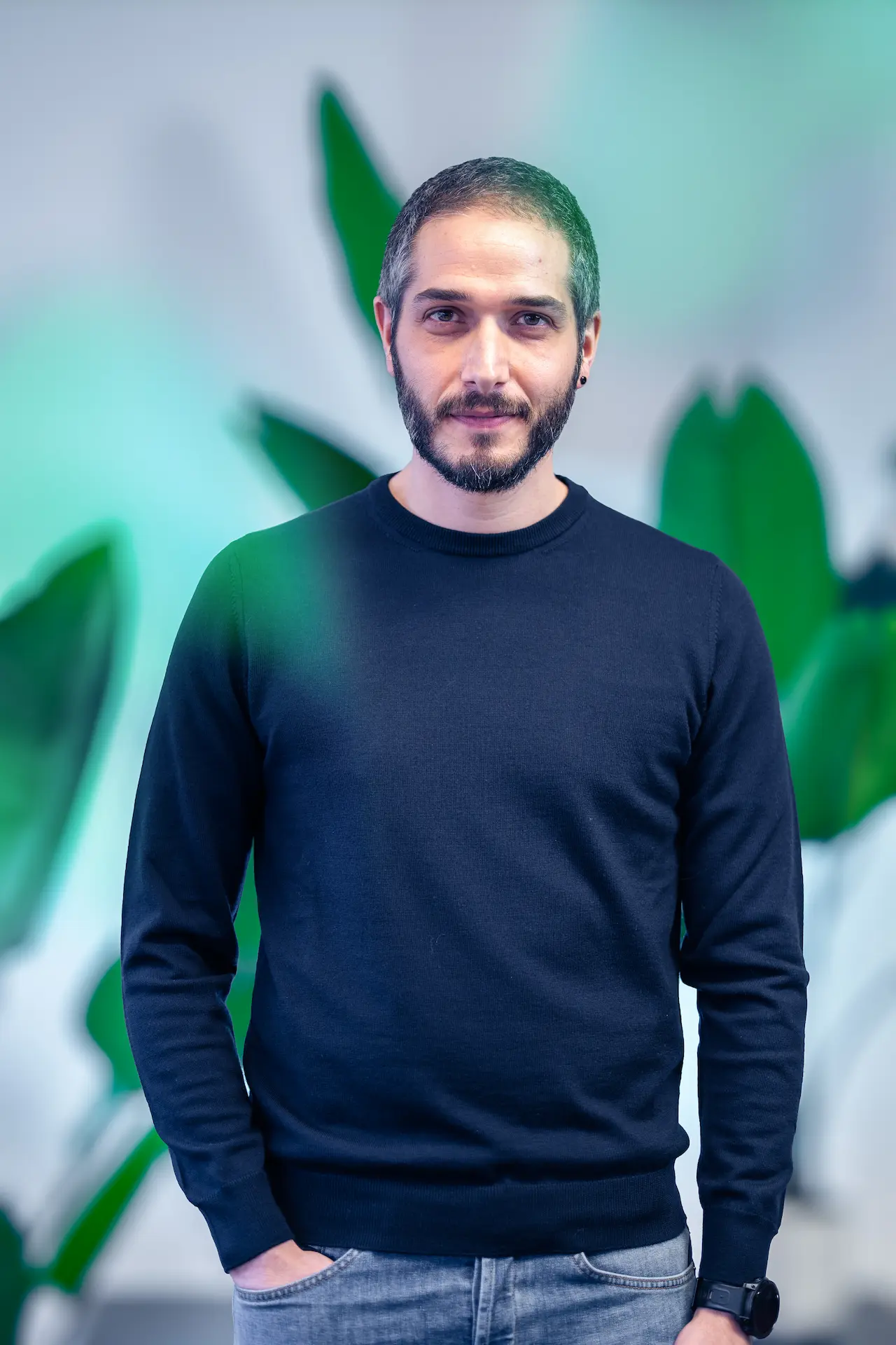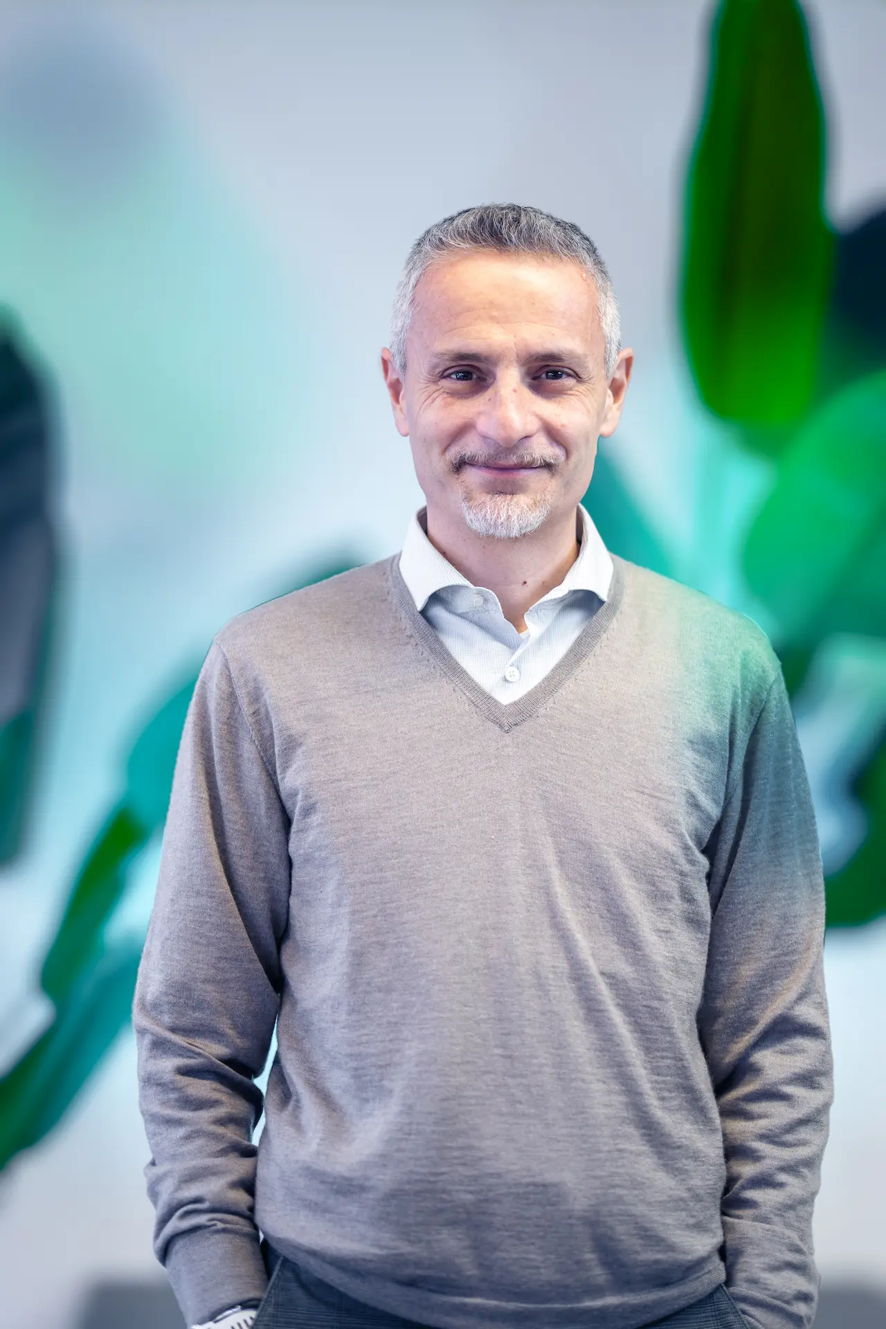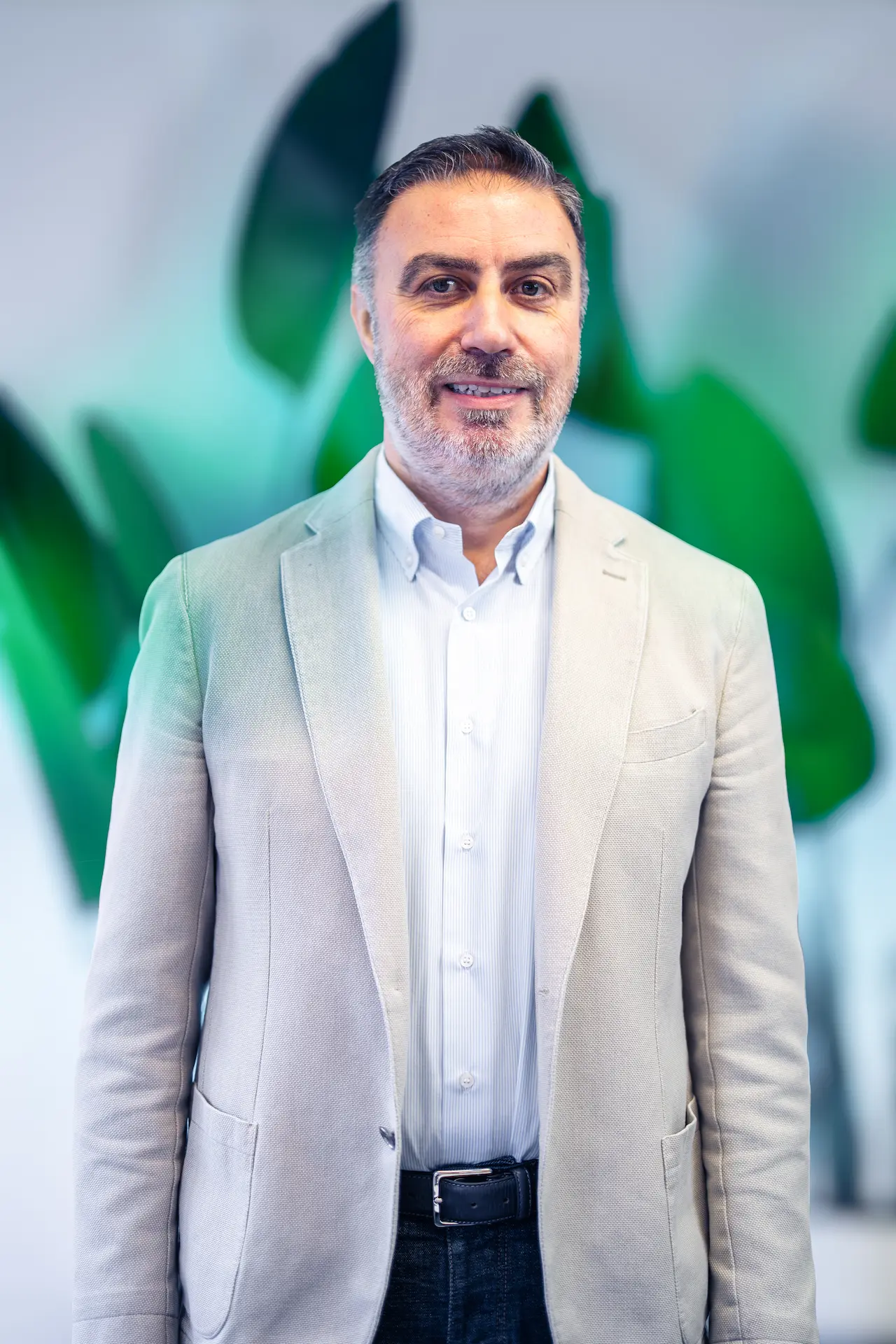 Un uomo con barba brizzolata e camicia chiara, seduto a un tavolo con un laptop, osserva con attenzione il collega di spalle mentre discutono di un progetto in un ufficio luminoso, con grandi piante verdi sullo sfondo.