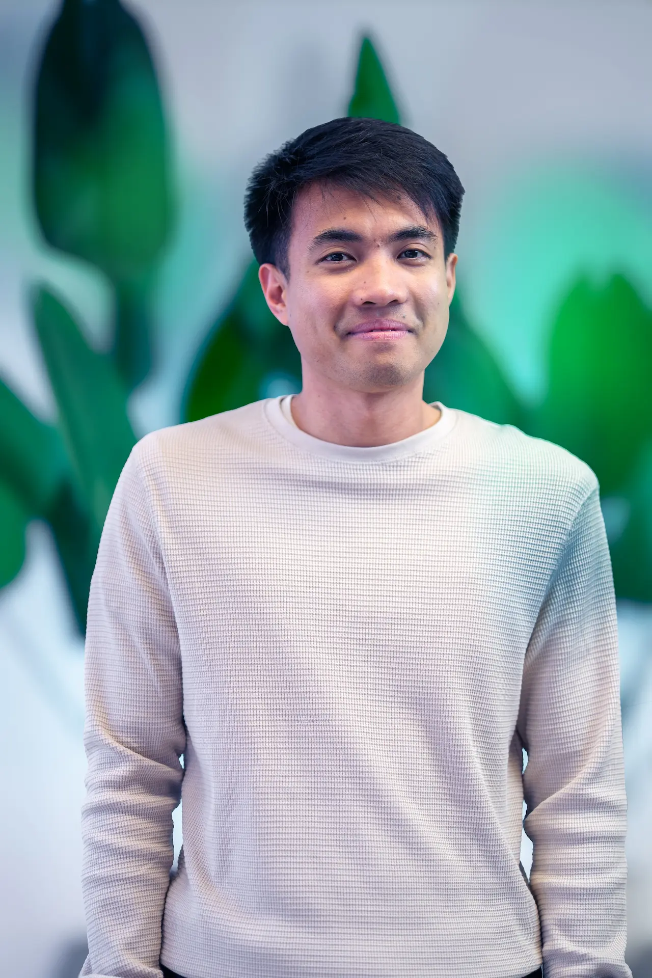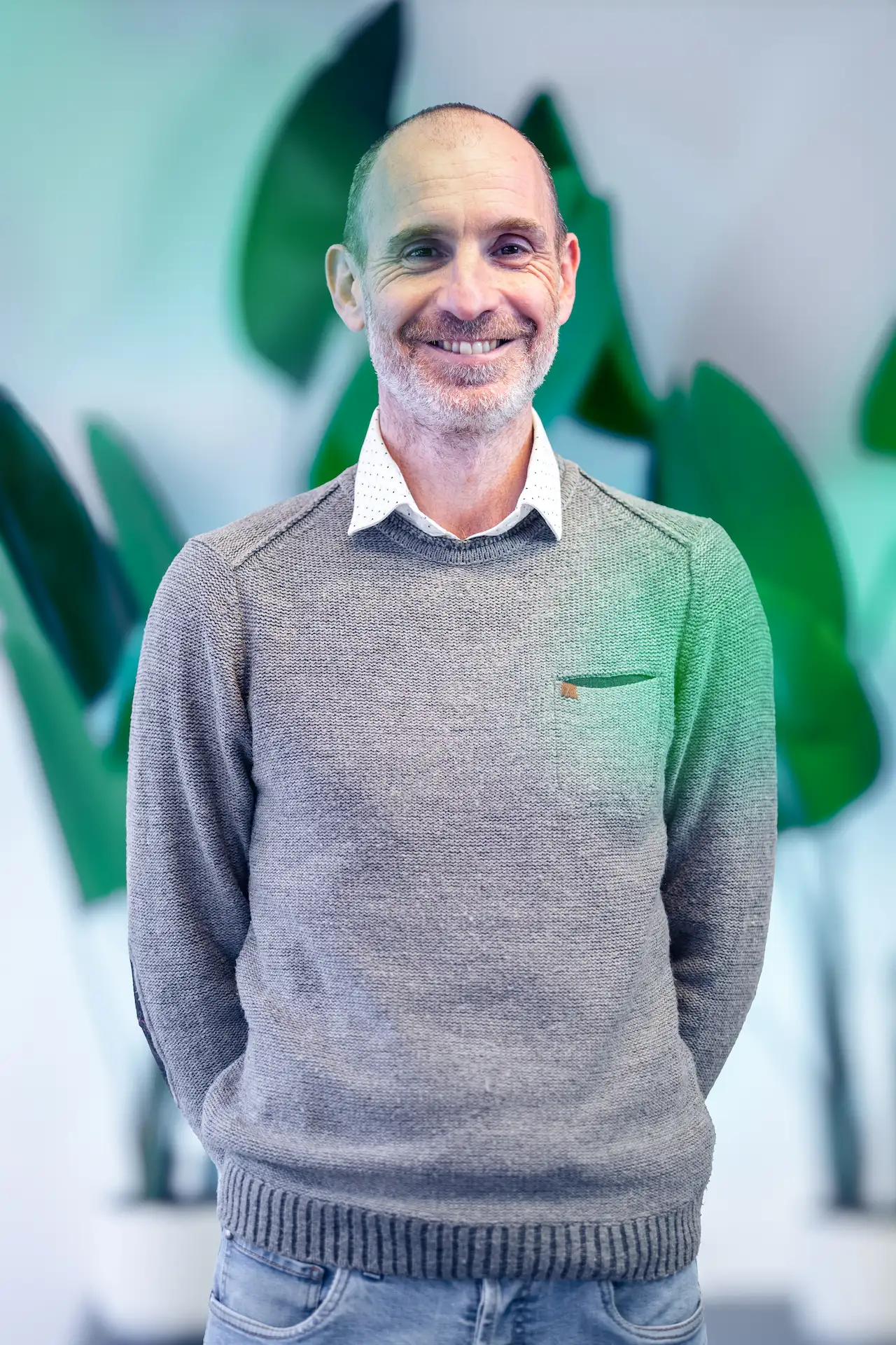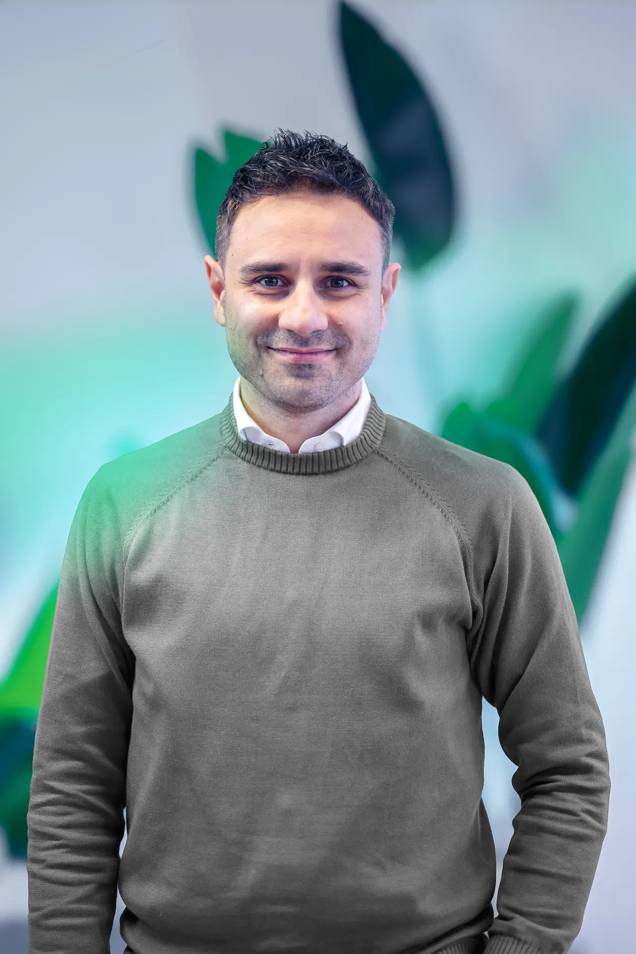 Un uomo con barba brizzolata e camicia chiara, seduto a un tavolo con un laptop, osserva con attenzione il collega di spalle mentre discutono di un progetto in un ufficio luminoso, con grandi piante verdi sullo sfondo.